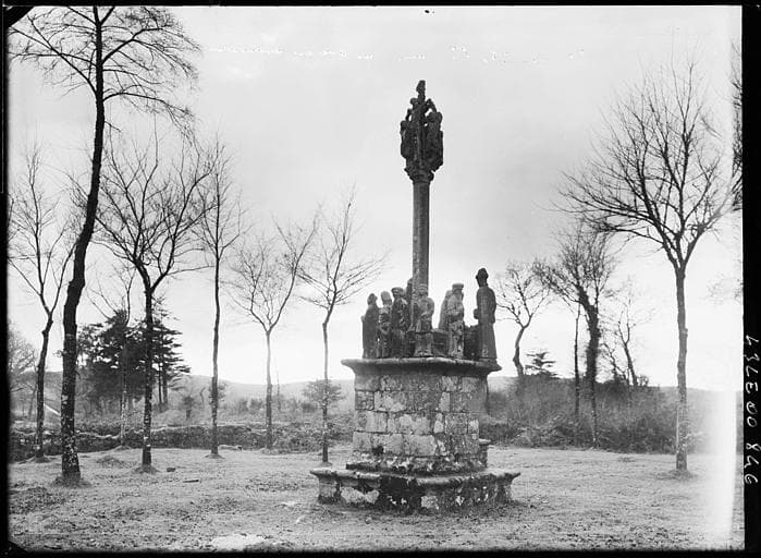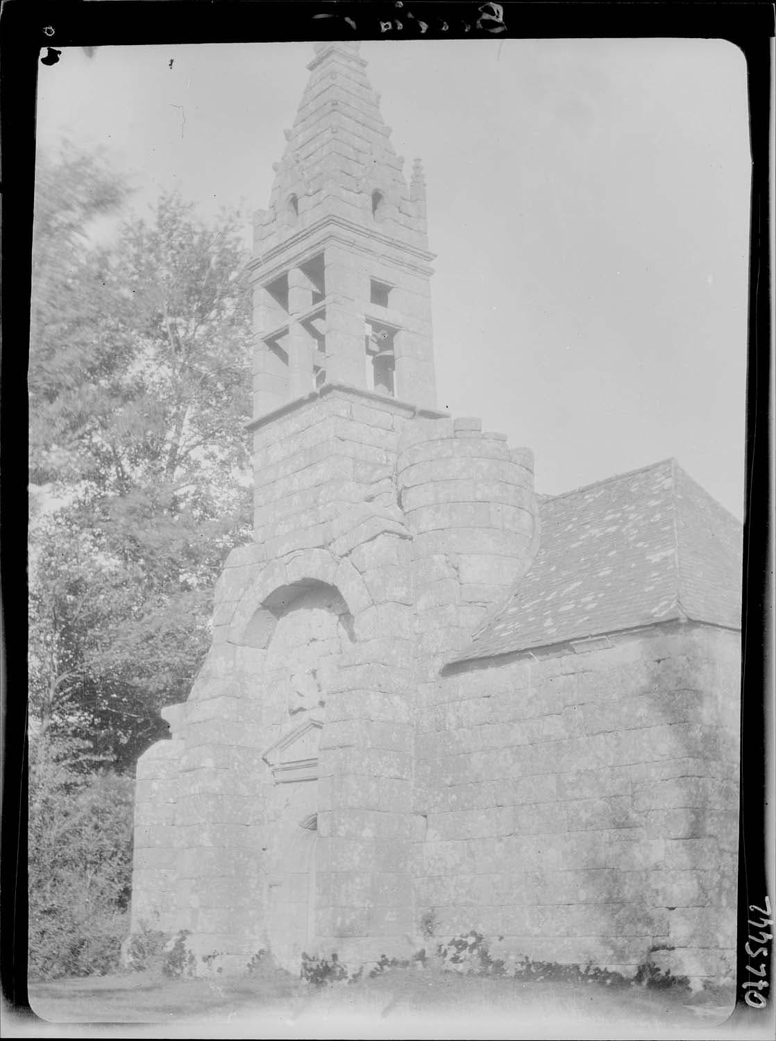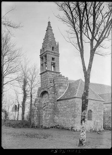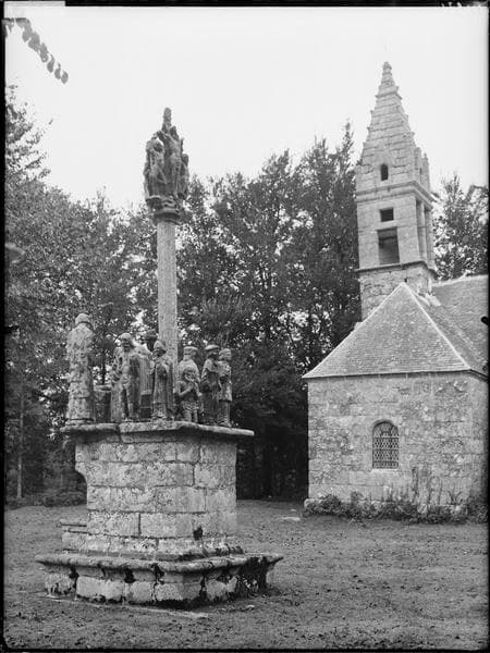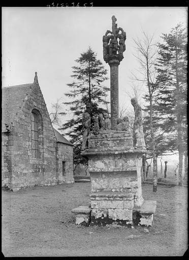 Le calvaire date du 16e siècle, tandis que la chapelle et le cimetière sont des 17e et 18e siècles.£La chapelle, lieu de pèlerinage situé dans un enclos, présente un intérêt par sa façade occidentale et son clocher. Cette façade se compose d'un portail encadré de deux contreforts reliés entre eux par un arc en plein cintre. Au-dessus, s'élève une tour carrée terminée par une flèche en pierre ornée de lucarnes et fleurons. Le portail du 17e siècle, en plein cintre, est surmonté d'un fronton et encadré de deux pilastres ornés de rosaces et de losanges inspirés du style Renaissance. Ces pilastres se prolongent verticalement jusqu'aux extrémités du fronton qu'ils traversent. Au-dessus, se trouve un cartouche encadré de deux lions. Le clocher comprend, au-dessus d'un socle carré, une construction ajourée avec meneaux et traverses pour supporter les cloches. L'entablement comporte architrave, frise et corniche.£