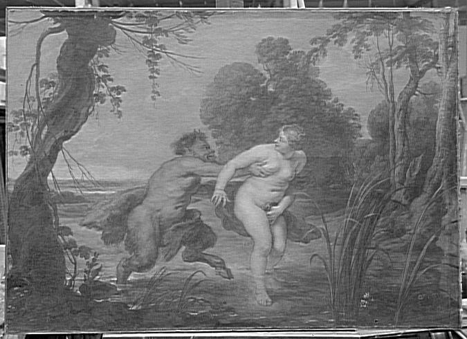 scène mythologique (Pan, poursuite, Syrinx : nu, caresse, roseau) ; fond de paysage