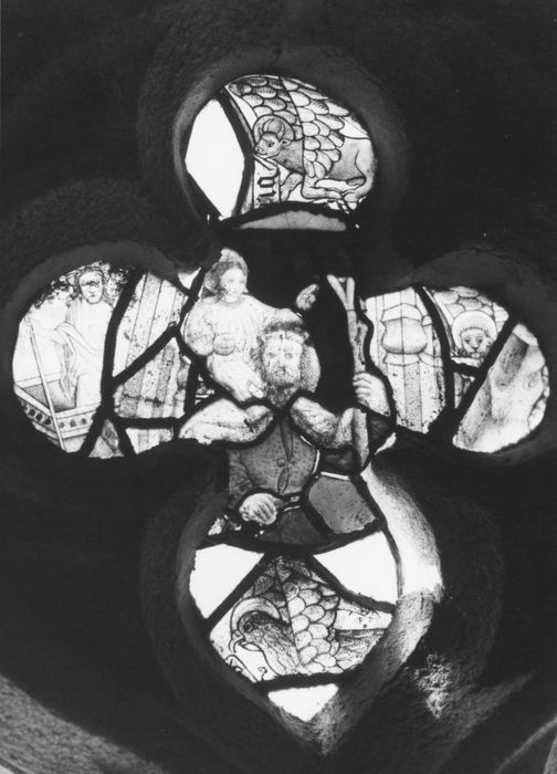 3 verrières : deux anges, saint Christophe, taureau (un)