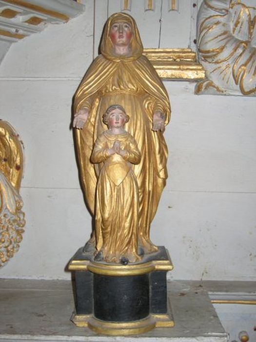 Sainte Anne, vêtue d'une robe et d'un manteau dont la capuche lui couvre la tête, se tient debout. Devant elle, debout, les mains jointes en signe de prière se trouve la Vierge enfant.
