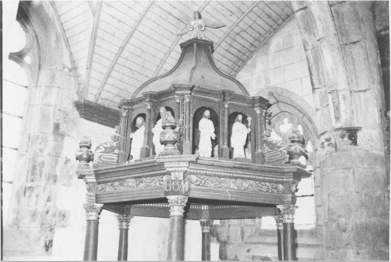 Les statuettes des douze apôtres figurent sur ce baldaquin surmonté d'un ange. Il comporte également un groupe représentant le Baptême du Christ.