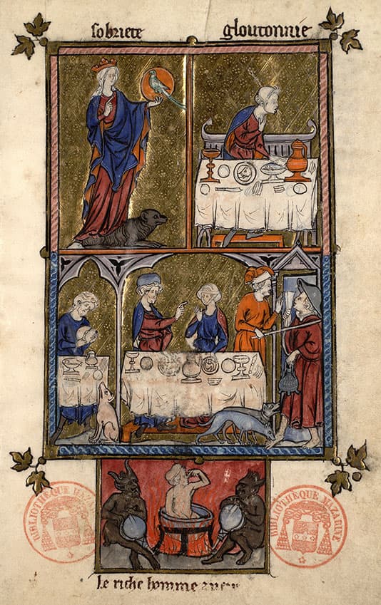 Opposition thématique : dans le registre de gauche, figure représentant la Sobriété et dans le registre de droite scène représentant la Gloutonnerie. Dans le registre de droite, Lazare vient mendier auprès du mauvais riche ; dans la partie centrale se déroule un repas et une conversation entre un homme et une femme hésitant à donner de la nourriture (?) ; dans le registre gauche, un serviteur coupe du pain pour le donner à un chien. Dans le registre inférieur, le riche est en enfer.