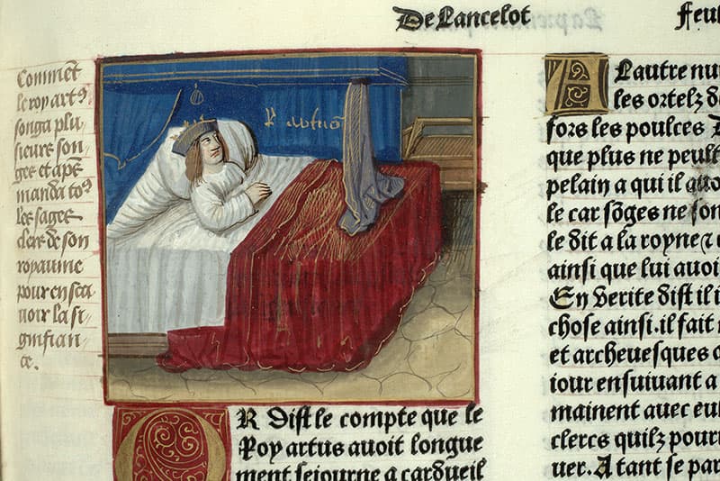 Rubrique : 'Comment le roy artus songa plusieurs songes et apres manda tous les sages clers de son royaume pour en scavoir la signifiance'. Inscription du nom : 'R. artus'.