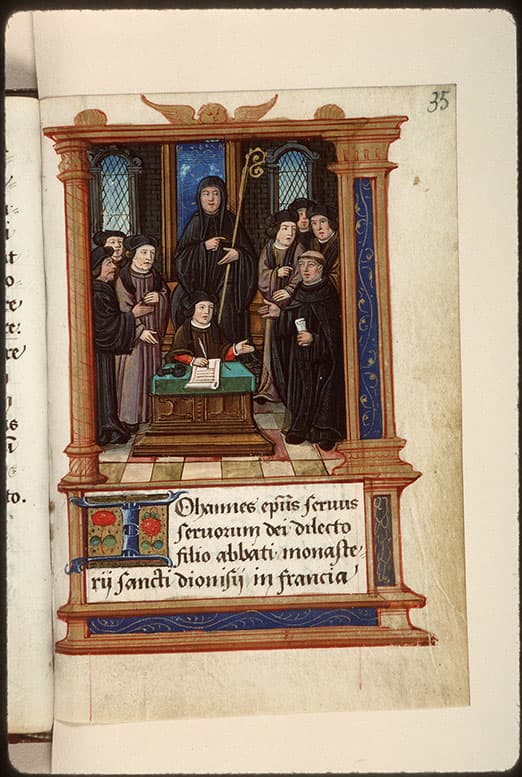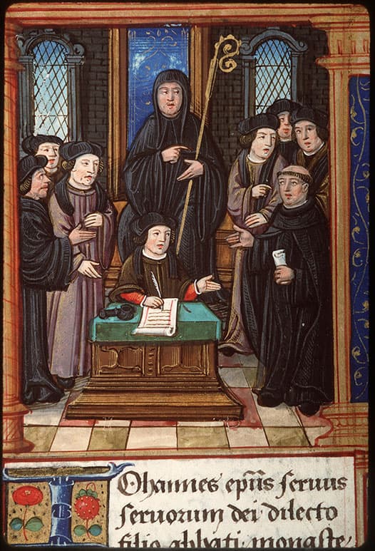 A droite, le frère hospitalier de la Charité de Notre-Dame de Roignon plaide devant les légats du Saint-Siège afin que son ordre ne donne plus cinq livres de cire chaque année à la Chambre apostolique. L'abbé et le notaire, assis au centre, désignent le religieux, signifiant ainsi que sa requête est acceptée.