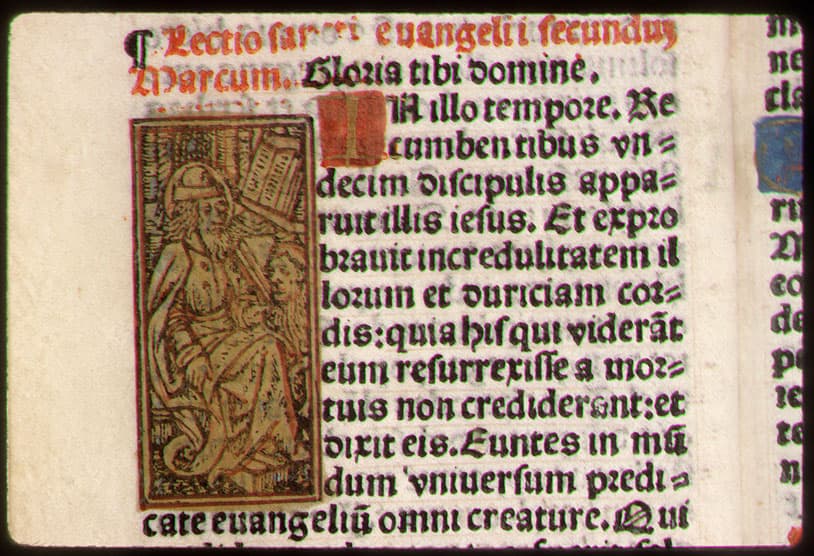 Gravure coloriée au début de l'Evangile de Marc