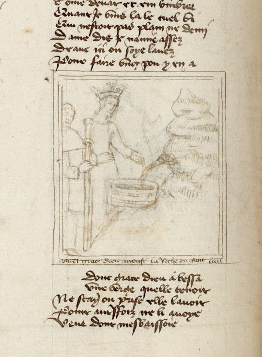 Miniature en tête du vers 11310 (éd. Stürzinger, 1897). Légende : 'grace dieu moust la roche ou estoit l'oeil'.