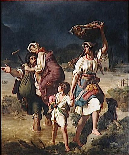 UNE FAMILLE DE CONTADINI SURPRISE PAR UN PROMPT DEBORDEMENT DU TIBRE ; DIT PAYSANS DE LA CAMPAGNE ROMAINE FUYANT UNE INONDATION ; DIT AUTREFOIS L'INONDATION - POP