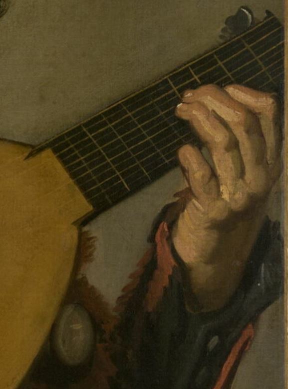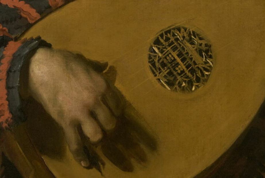scène (jeune homme, à mi-corps, sourire, luth, musique)