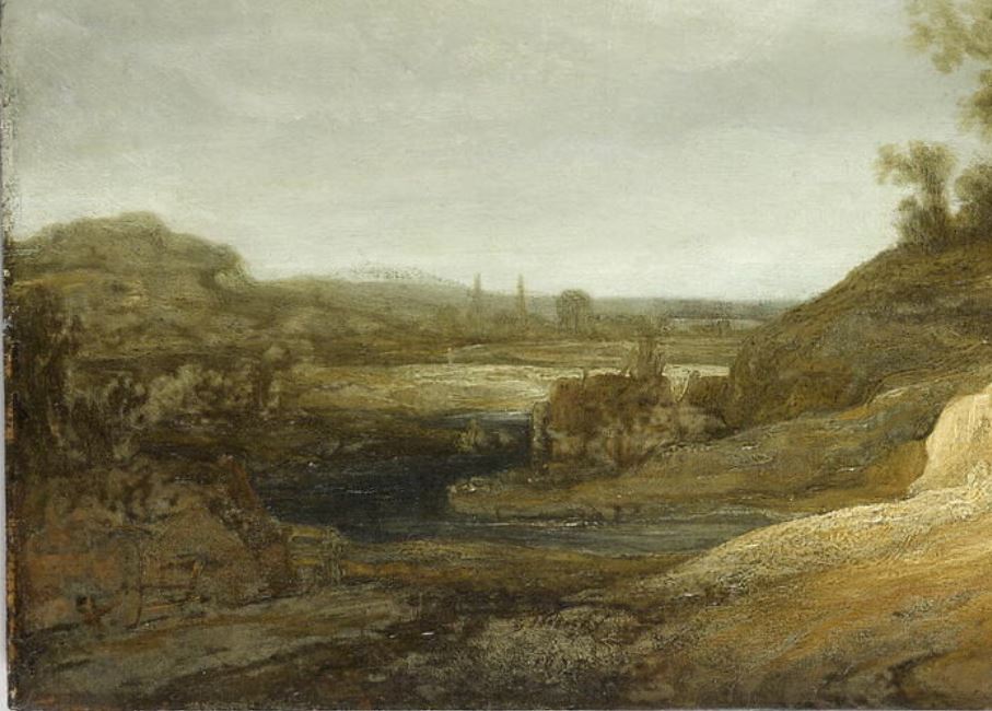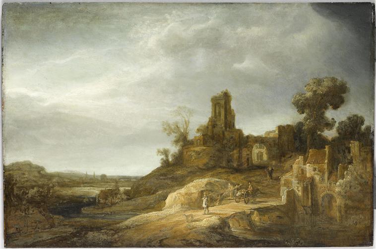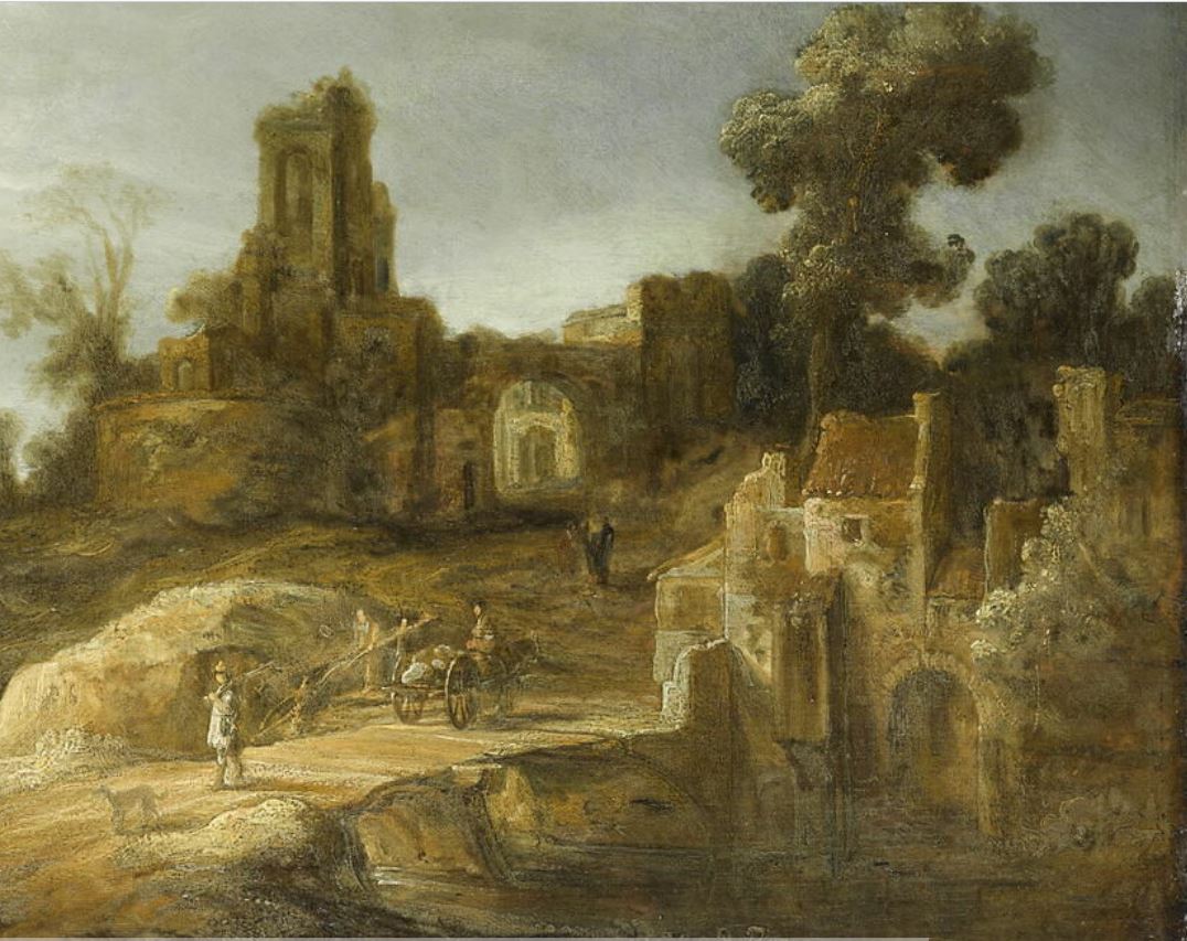 paysage (ruines, pont, rivière, plaine, feuillu, personnage, voiture à attelage, chien)