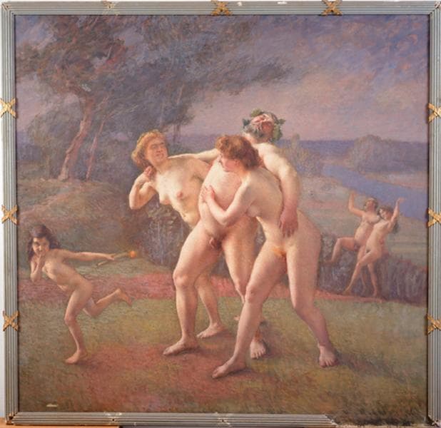 scène mythologique (les Nymphes, Silène, danse, couple, fillette, nu) ; fond de paysage