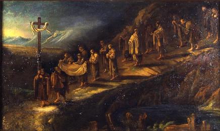 scène (procession, linceul, croix latine, étang) ; fond de paysage