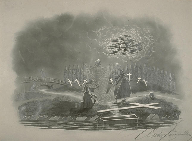 scène (lessive, linge de corps : cadavre, vieille, croix, cercueil, rivière, cimetière, crâne, os, pont, homme, cyprès, lune, nuage, effet de lumière, allégorie)