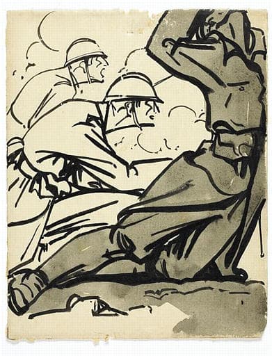 scène (assaut, soldat : uniforme : Français, mort par arme à feu, explosion, fumée)