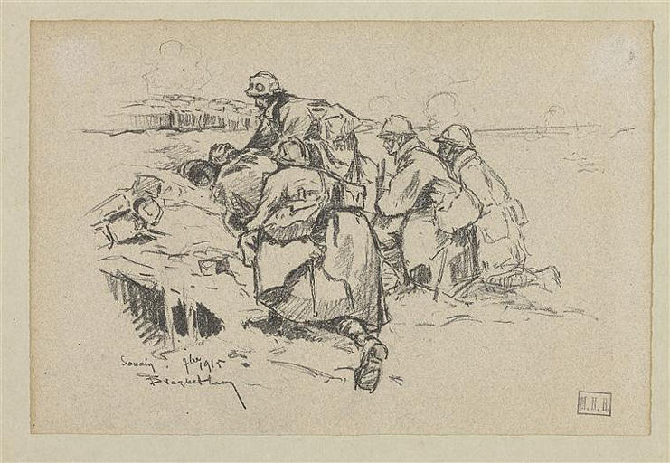 scène (soldat, agenouillé, fusil, cadavre, plaine, explosion, Souain)