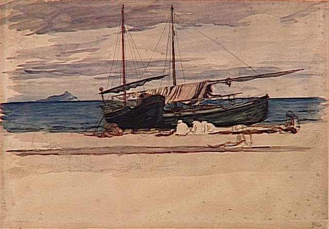 POP | Plateforme ouverte du patrimoinePORTO D'ANZIO, DEUX BARQUES ECHOUEES DEVANT UNE MER SOMBRE