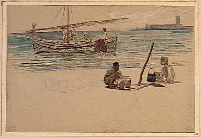 scène (homme : Italien, assis, cuisson, marmite, bord de mer, bateau à voiles, phare)