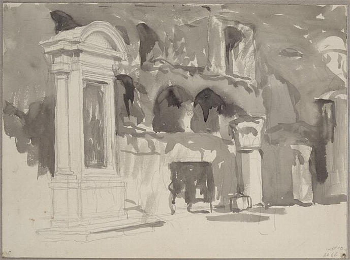 vue d'architecture (Rome, arènes, antiquité, arcade, chapelle, colonne, fronton)