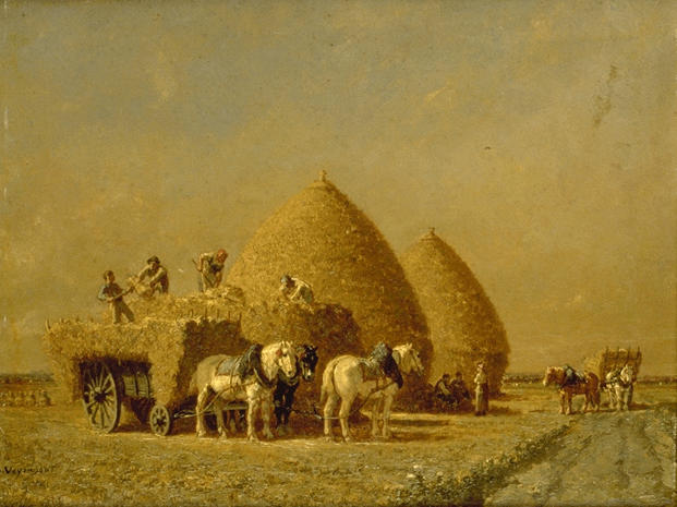 scène (charrette, cheval, chargement, meule, champ, personnage, effet de soleil)