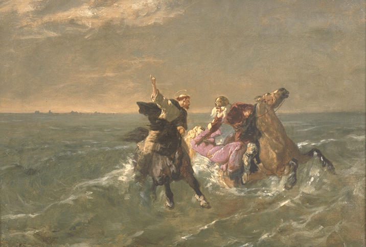 scène historique (saint Guénolé, Gradlon, roi, cheval, mer, vague, Dahut, femme, secours, Bretagne)