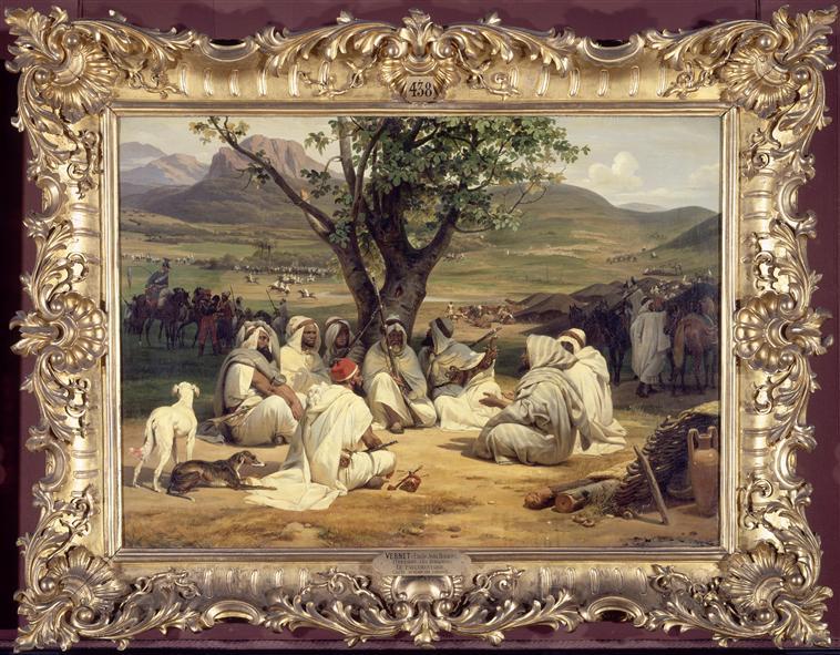 scène historique (guerre coloniale, entrevue : trève, souverain : Algérie, camp militaire, arme à feu, arme de main, lévrier, figuier) ; fond de paysage (montagne)