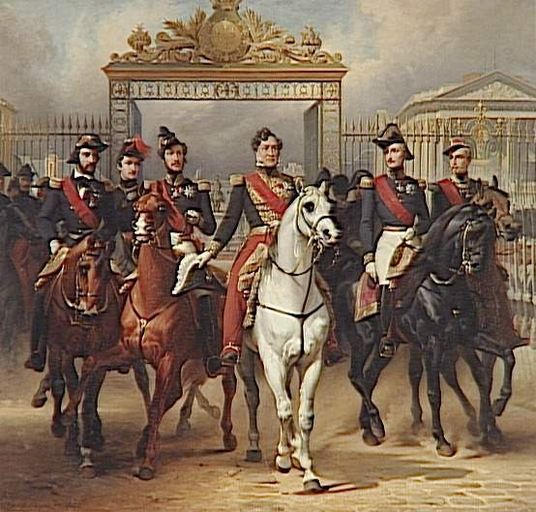 portrait collectif (famille, Orléans Louis Philippe d', équestre, cheval, uniforme) ; ferronnerie (grille) ; Versailles (château) ; statue (équestre, cheval, Louis XIV)