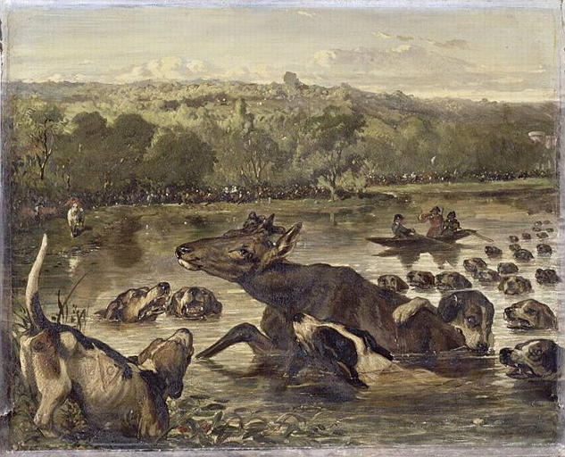 scène (chasse à courre, étang, chien, cerf, barque)