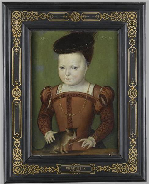 portrait (Charles IX : enfant, à mi-corps, de trois-quarts, robe, chapeau, bijou, chat : caresse)