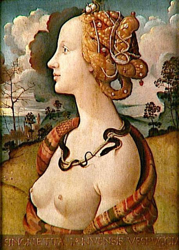 portrait (Vespucci Simonetta, ?, rétrospectif, femme, en buste, de profil, nudité : poitrine, coiffure, bijou, serpent : symbole : mort, ?) ; fond de paysage