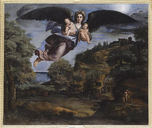 figure (allégorie : nuit, femme, dans les airs, aile, portage : enfant, symbole : sommeil, mort) ; paysage (maison, feuillu, mer, nuit, clair de lune, personnage)