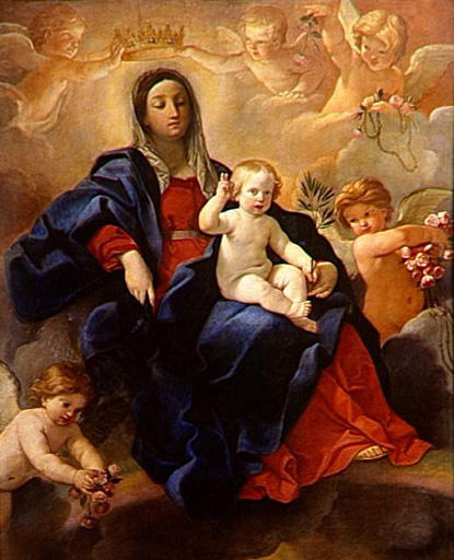 figures bibliques (Vierge à l'Enfant, ange, rose, couronne, nuée, branche : olivier)