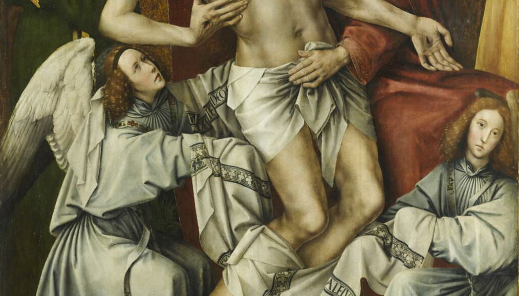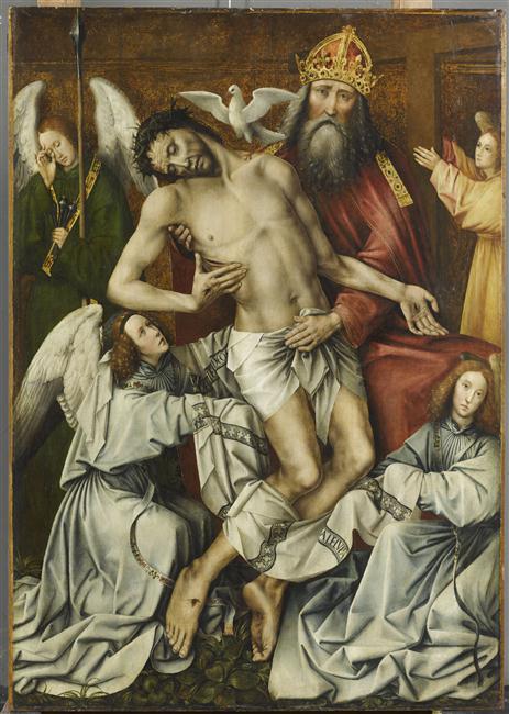 scène biblique (Trinité, Dieu le père : pape, Saint-Esprit : colombe, Christ mort, linceul, ange)