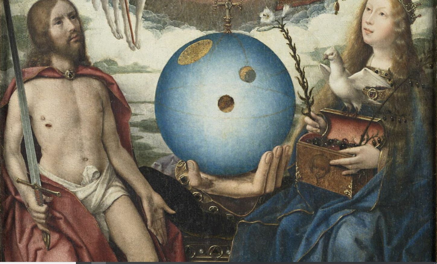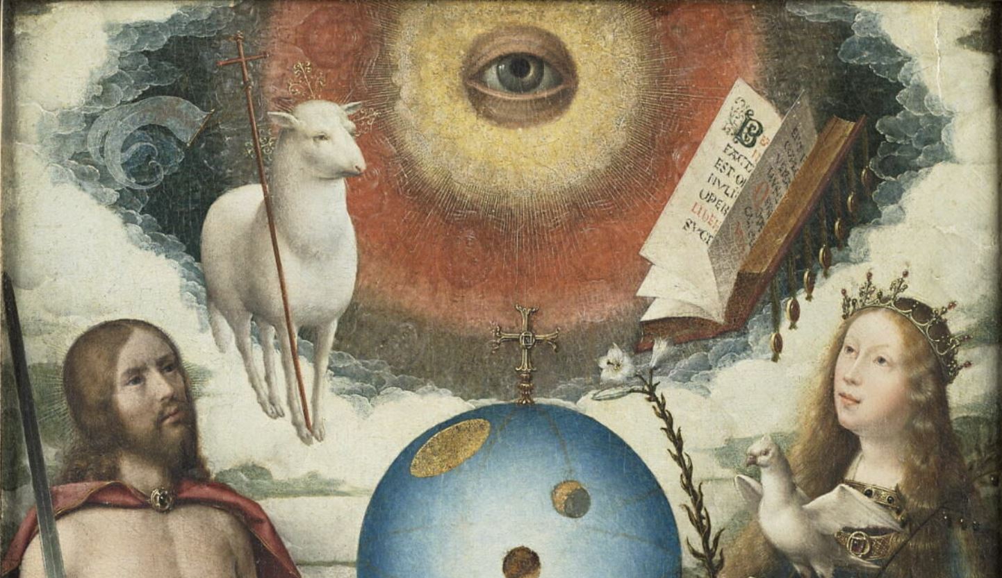 figures bibliques (allégorie, l'Eglise, Christ juge, boîte, Vierge, Saint-Esprit : colombe, agneau mystique, livre, lys, globe, Dieu le père : main, oeil)