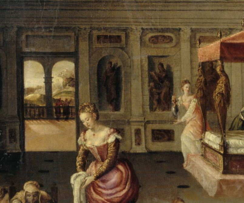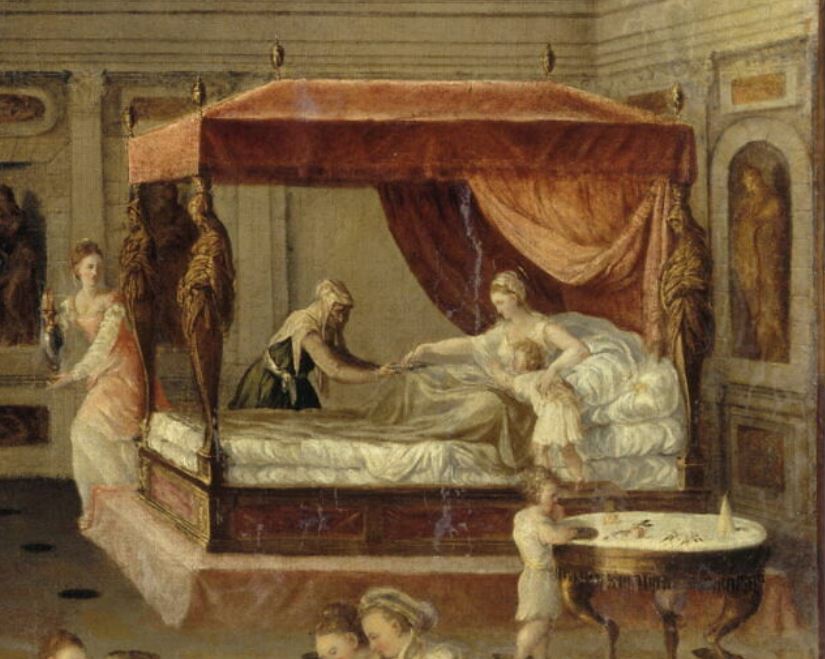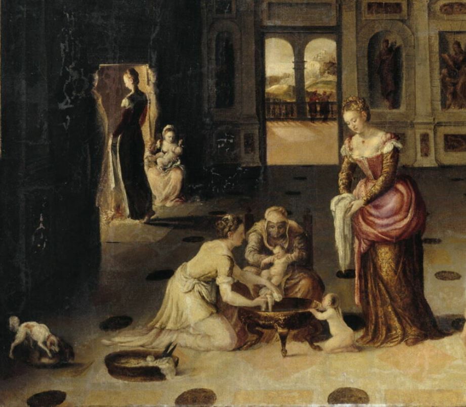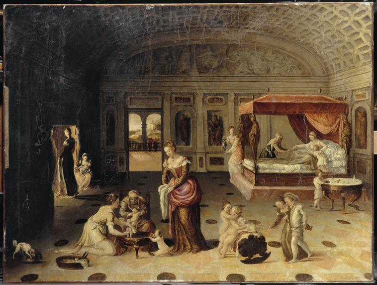 scène biblique (naissance, saint Jean-Baptiste, femme, enfant, soin, nourrisson, lit, berceau, intérieur, chien)
