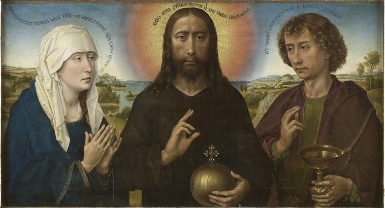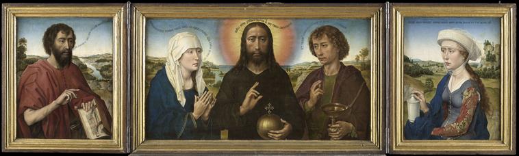 sur volet central ; figures bibliques (Christ, globe, Vierge, saint Jean) ; fond de paysage ; sur volet gauche ; figure biblique (saint Jean-Baptiste, livre) ; fond de paysage ; sur volet droit ; figure biblique (sainte Madeleine) ; fond de paysage ; crâne ; armoiries ; croix