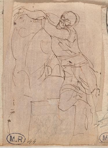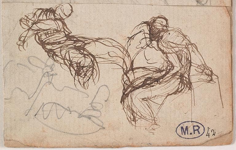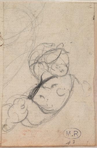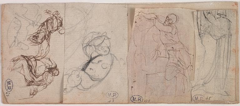 POP | Plateforme ouverte du patrimoineFEUILLE DE QUATRE CROQUIS : PERSONNAGES DRAPES ET ASSIS ; ENFANT NU A DEMI-ALLONGE ; HOMME APPUYE CONTRE UN TORSE ; DRAPE
