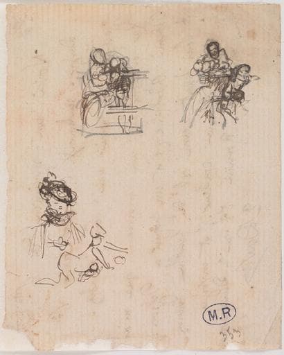 FEUILLE DE CROQUIS : FEMME ET ENFANTS PENCHES A UNE BALUSTRADE (?) ; MEME SCENE ; BUSTE DE FEMME EN CHAPEAU ; PERSONNAGE DE PROFIL ET A QUATRE PATTES