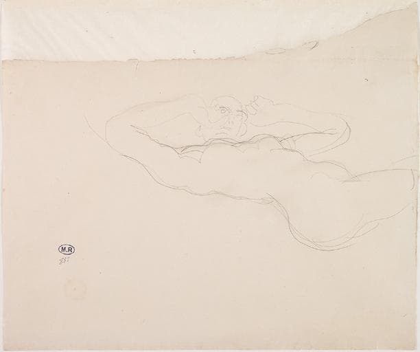 POP | Plateforme ouverte du patrimoineFEMME NUE ALLONGEE, LES BRAS RELEVES CONTRE LES TEMPES ; LES JAMBES SONT COUPEES PAR LE BORD DE LA FEUILLE