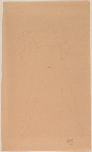 POP | Plateforme ouverte du patrimoineFEMME NUE DEBOUT, DE FACE, JAMBES ECARTEES MAINS PRES DES EPAULES AU RECTO ; SILHOUETTE D'UN CORPS ET TRAITS A L'HORIZONTALE : AU VERSO
