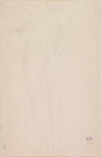 POP | Plateforme ouverte du patrimoineFEMME NUE DEBOUT, DE FACE, MAINS AUX HANCHES ; LA TETE EST COUPEE PAR LE BORD DE LA FEUILLE, JAMBE EN BAS A GAUCHE A L'ENVERS
