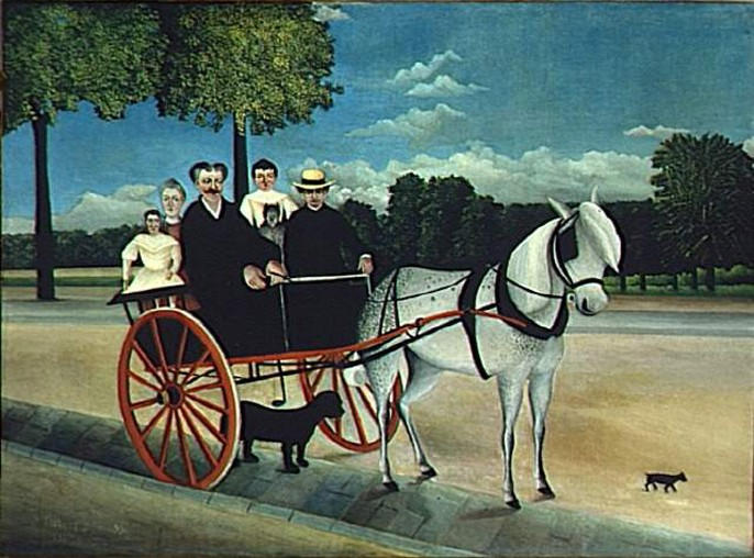 portrait collectif (Junier Claude, Junier Mme, Junier Léa, jeune fille, couple, chien, Rousseau Henri, assis, voiture à attelage, cheval) ; fond de paysage (feuillu, route)