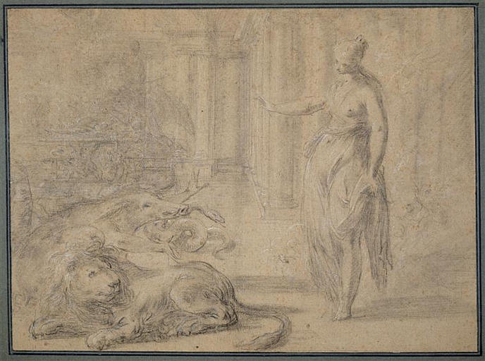 scène (croisade, Armide, magie, lion, sanglier, serpent) ; vue d'architecture (colonne, fontaine)