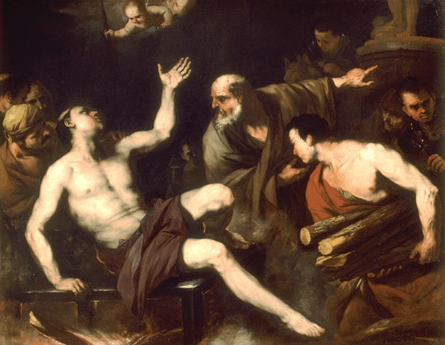 scène historique (saint Laurent diacre, martyre, peine de mort, mort par le feu, bois, ange, vieillard, bourreau)