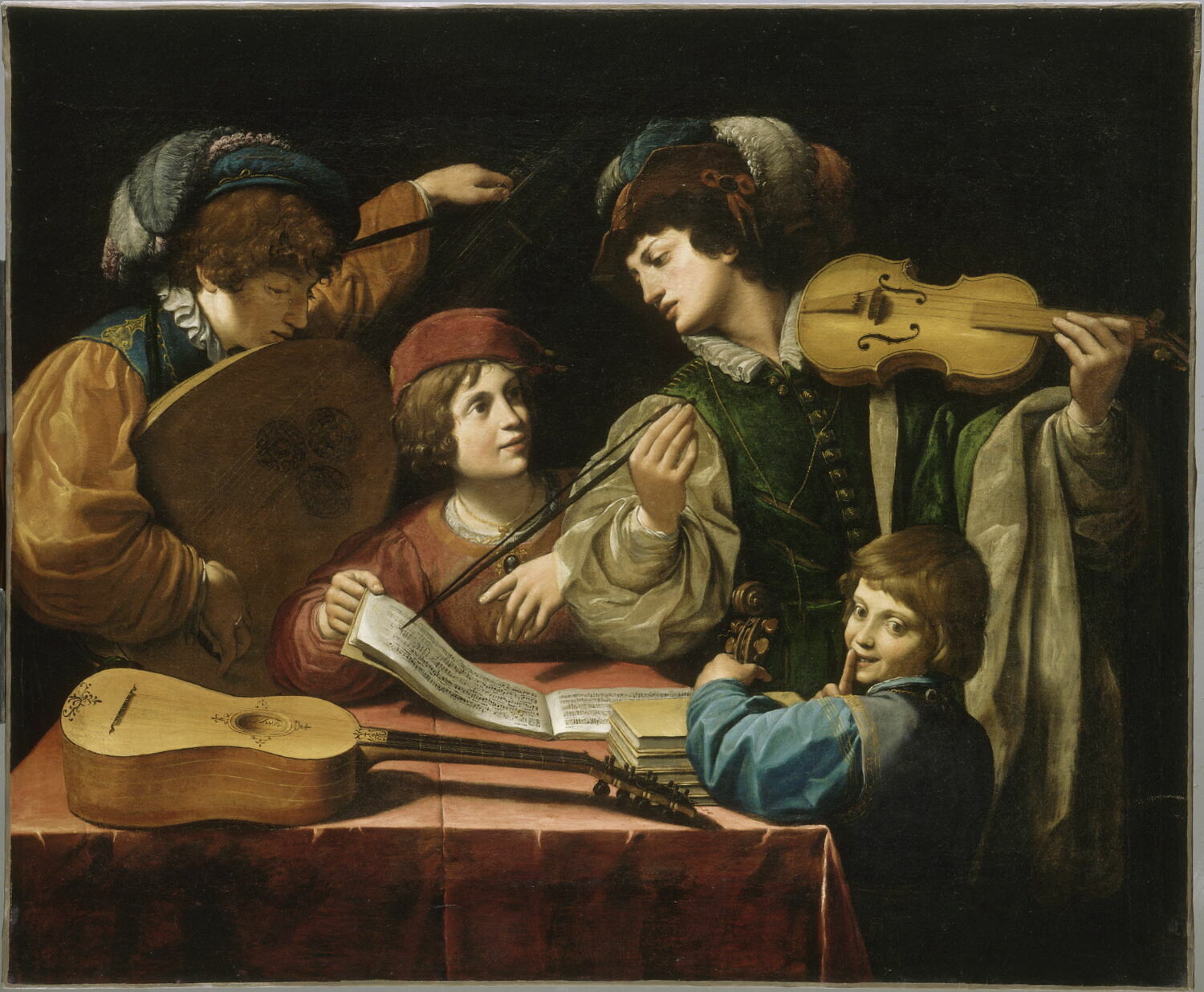 la partition figurant sur le tableau n'est pas lisible; les agrandissements dont fit l'objet ce tableau avant 1683 modifièrent certains détails:le vêtement du musicien de gauche et la main de celui de droite ont été complétés,le violon de droite a reçu une crosse,celui du musicien de gauche a vu le décor de sa caisse prolongée,d'un dessin plus malhabile