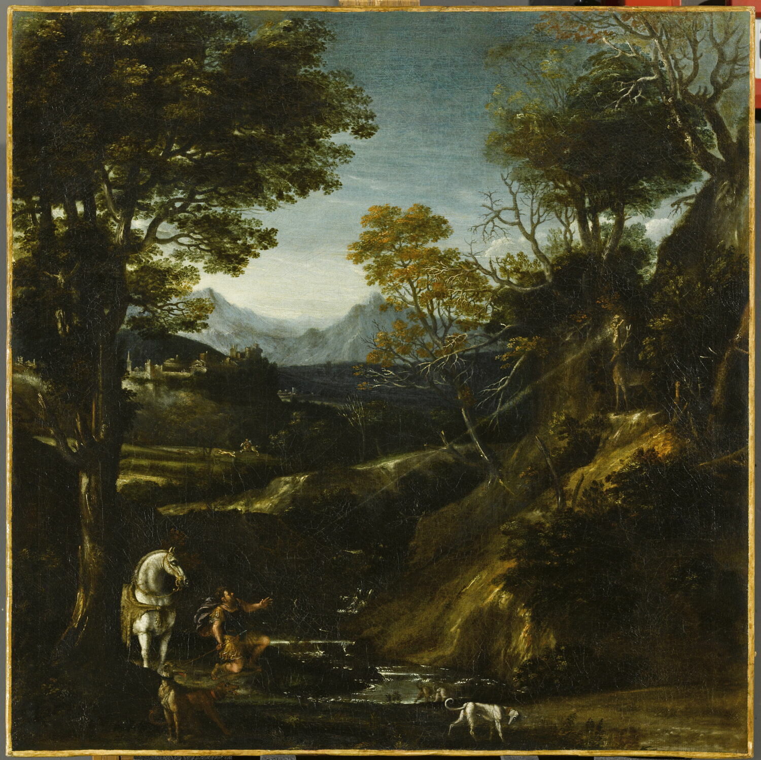 autre version autrefois au musée d'Issoudun(paysage avec saint Hubert,tableau disparu depuis 1940,Inv 787);composition dérivant probablement de la Vision de saint Eustache par Annibal Carrache conservée au musée de Capodimonte à Naples;la composition dérive manifestement d'une estampe de Cornelis Gort d'après un dessin de Girolamo Muziano sur ce sujet;ce tableau a vraisemblablement été conçu comme un pendant d'un saint Jean-Baptiste dans le désert par Paul Brill de mêmes dimensions(Louvre)qui l'accompagnait déjà dans la collection Mazarin;il ne semble pas y avoir de raison particulière d'associer le thème de la vision de saint Eustache à celui du Saint Jean-Baptiste dans le désert de Brill,si ce n'est que les deux sujets montrent des saints solitaires au milieu d'une nature sauvage et hostile,en compagnie d'un animal dont la présence est significative pour leur histoire