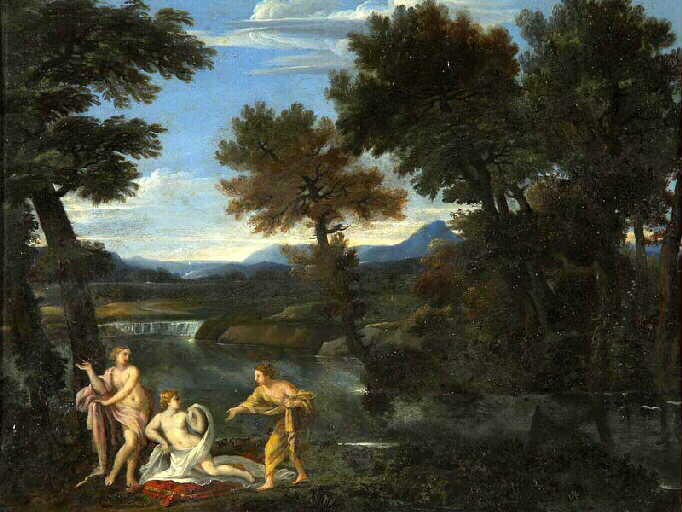 paysage(forêt, feuillu, rivière, cascade, rocher, montagne, bâtiment, femme : nudité, draperie, baignade, repos, conversation)
