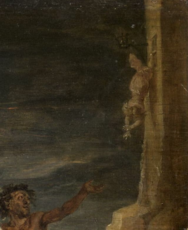 Copie d'après Domenico Fetti, Héro et Léandre, Vienne, Kunsthistorisches Museum. Teniers a également reproduit le Héro et Léandre de Fetti dans son grand tableau La Galerie de peintures de l'archiduc Léopold-Guillaume, vers 1651-1653, Munich, Alte Pinakothek. Teniers était en quelque sorte le conservateur (camérier) du Cabinet de l'archiduc Léopold-Guillaume, lequel possédait une collection d'art hors du commun. Teniers a sans doute conseillé l'archiduc dans ses achats, mais il a surtout fait graver et publier à ses frais un choix de 243 tableaux de maîtres italiens, soit le Theatrum pictorium dont la première édition, suivie de plusieurs autres, parut à Bruxelles en 1660. Dès avant 1656, Teniers se mettait à la tâche en peignant de petits modelli pour ses graveurs, dont le présent exemple, donné à graver à Théodore Van Kessel. Teniers a ainsi délibérément rapetissé le tableau nettement allongé de Fetti pour le soumettre au format unifié des planches gravées. Il existe une autre copie de ce Fetti, censée porter le monogramme de Teniers, mais cette attribution demeure douteuse (toile, H. 56, l.83, depuis 1742 au moins dans la collection Spencer à Althorp, Grande-Bretagne ; vendue à Londres (Sotheby's) le 3 juillet 1985, no 60 ; en 1986 chez Van Haeften à Londres ; tableau repassé en vente publique comme Teniers à New York (Sotheby's) le 2 juin 1989, no 22 avec repr. en couleurs)