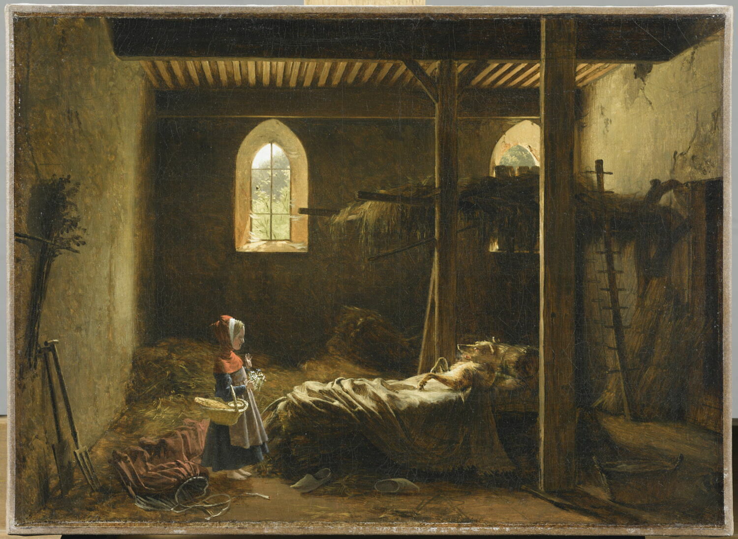 scène (Petit Chaperon rouge, loup, couché sur le dos, lit, foin, paille, outil agricole, église, intérieur, jupe)