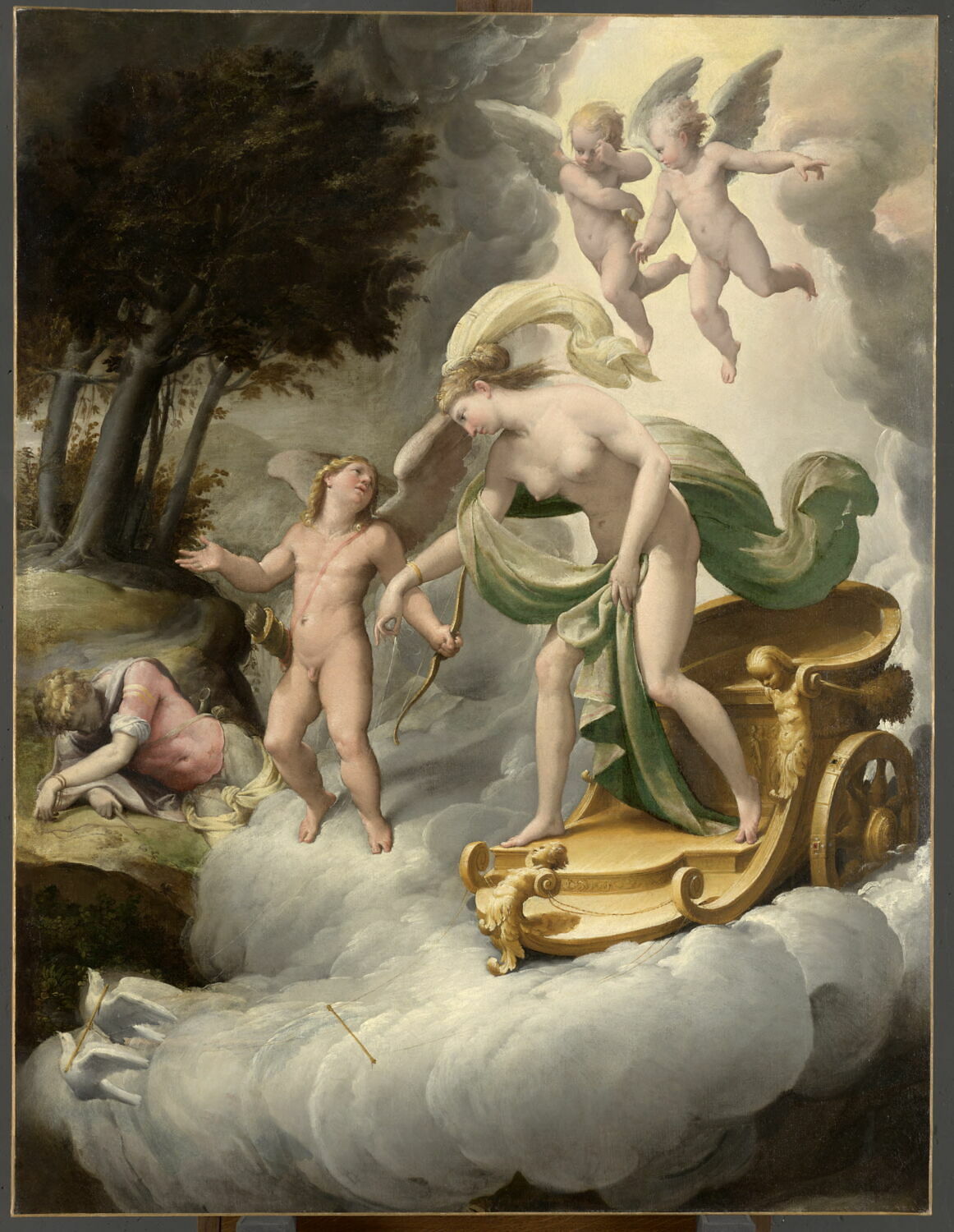scène mythologique (Vénus, nudité, draperie, char, Cupidon, colombe,nuage, Adonis : cadavre, feuillu)