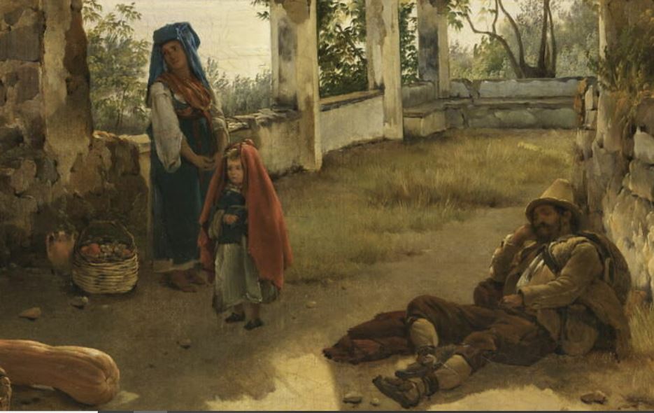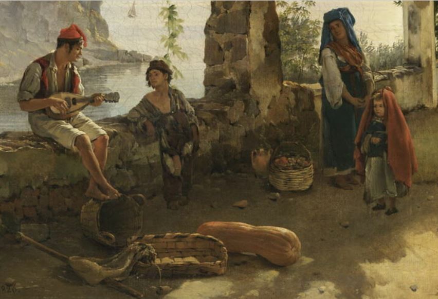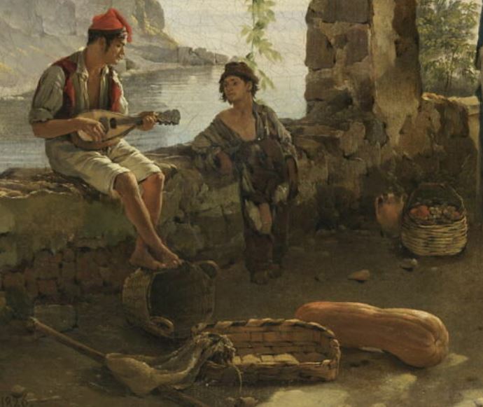 scène (Sorrente, terrasse, vigne, bord de mer, Méditerranée, personnage, musique, mandoline)