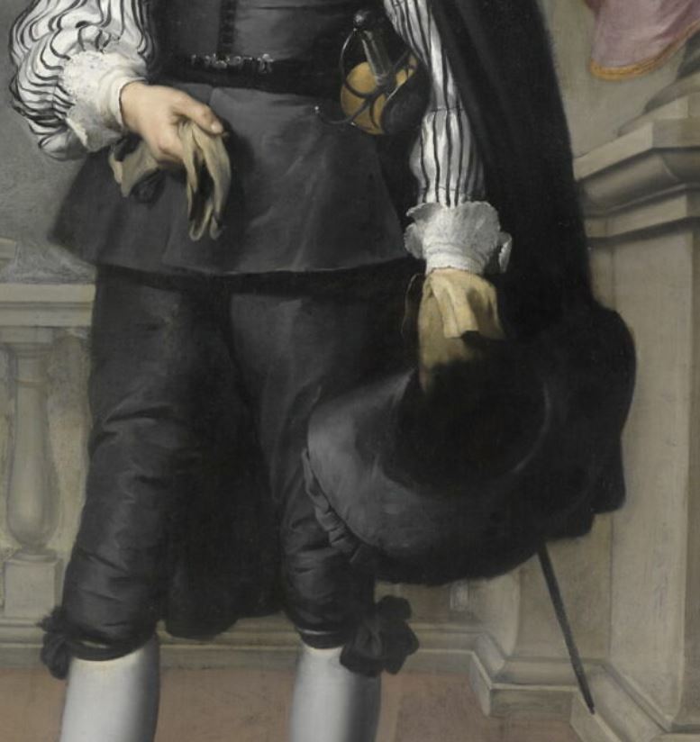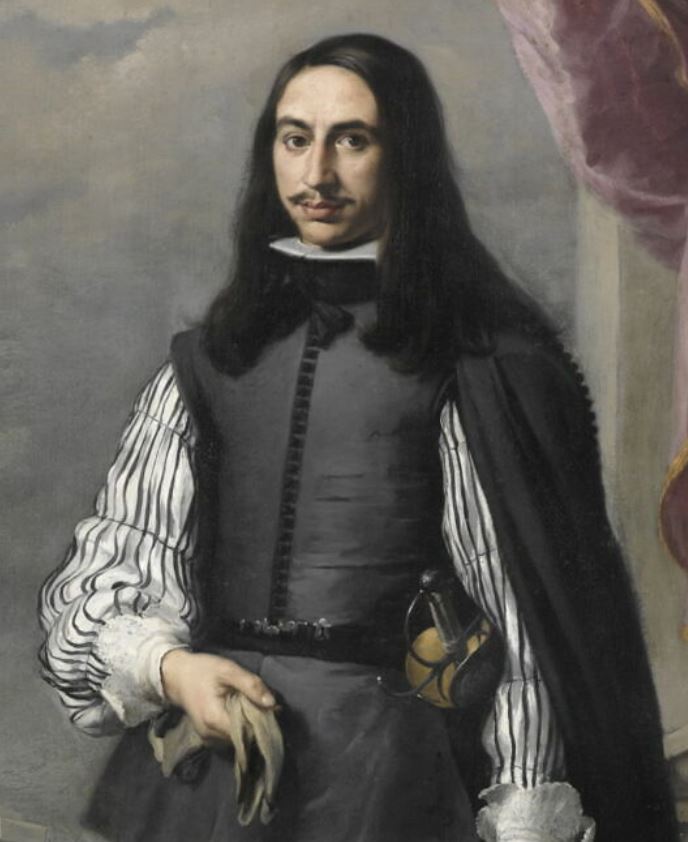 portrait (Velasco Inigo Melchior Fernandez de, homme, en pied, épée, gant, chemise : rayure, chapeau, colone, draperie)